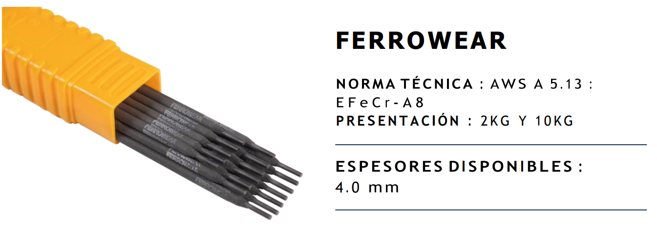 El Electrodo FERROWEAR está diseñado para aplicaciones de revestimiento duro y protección contra desgaste severo, ofreciendo una alta resistencia a la abrasión y al impacto. Cumple con la norma técnica AWS A5.13 EFeCr-A8, asegurando un desempeño superior para extender la vida útil de piezas y maquinaria en ambientes industriales exigentes.