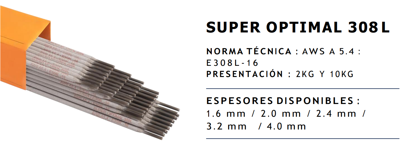 El Electrodo SUPER OPTIMAL 308L está diseñado para la soldadura de acero inoxidable, ofreciendo excelente resistencia a la corrosión, arco estable y acabado de alta calidad en el cordón de soldadura. Cumple con la norma técnica AWS A5.4 E308L-16, garantizando un desempeño confiable en aplicaciones industriales, fabricación de equipos y estructuras en acero inoxidable.