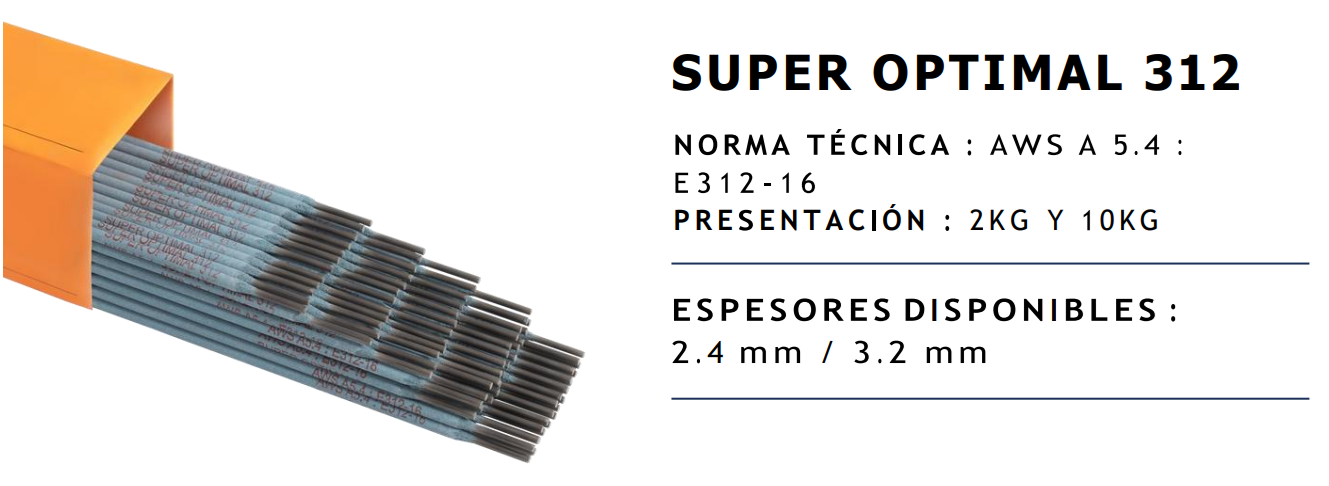 El Electrodo SUPER OPTIMAL 312 está diseñado para la soldadura de aceros inoxidables y uniones disímiles entre acero inoxidable y acero al carbono, ofreciendo alta resistencia a la corrosión, arco estable y cordones de soldadura duraderos. Cumple con la norma técnica AWS A5.4 E312-16, garantizando un rendimiento confiable en aplicaciones industriales y trabajos especializados.