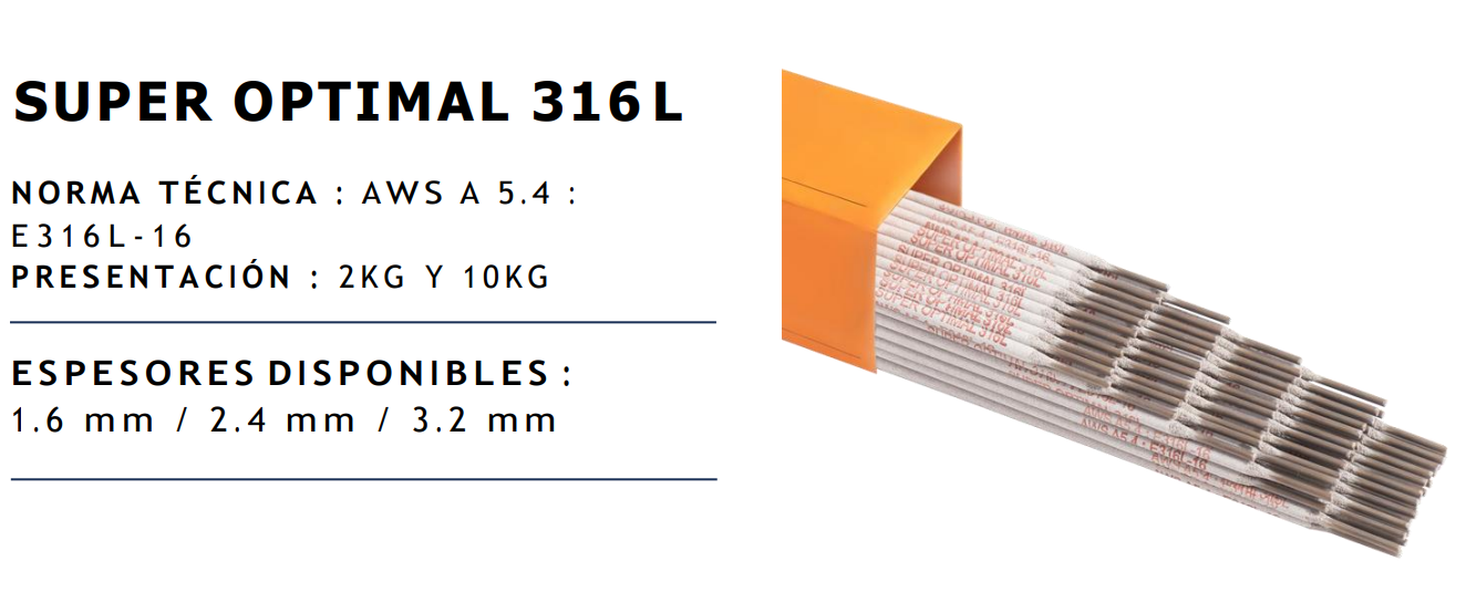 El Electrodo SUPER OPTIMAL 316L está diseñado para la soldadura de acero inoxidable austenítico resistente a la corrosión, ofreciendo arco estable, excelente acabado del cordón y alta resistencia a ambientes agresivos. Cumple con la norma técnica AWS A5.4 E316L-16, garantizando un rendimiento confiable en aplicaciones industriales, químicas y marítimas.