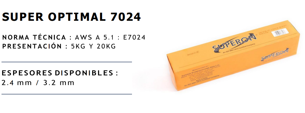 El Electrodo SUPER OPTIMAL 7024 está diseñado para la soldadura de acero al carbono, ofreciendo alta tasa de deposición, arco estable y excelente acabado del cordón de soldadura. Cumple con la norma técnica AWS A5.1 E7024, garantizando un rendimiento confiable en aplicaciones de fabricación metálica y trabajos industriales.
