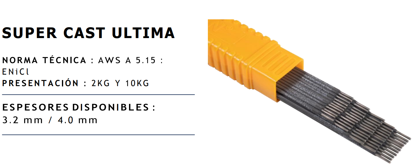 El Electrodo SUPER CAST ULTIMA está diseñado para la soldadura de fierro fundido, ofreciendo una excelente unión, alta resistencia mecánica y arco estable. Cumple con la norma técnica AWS A5.15 ENiCl, garantizando resultados confiables en reparaciones y fabricación de piezas fundidas.