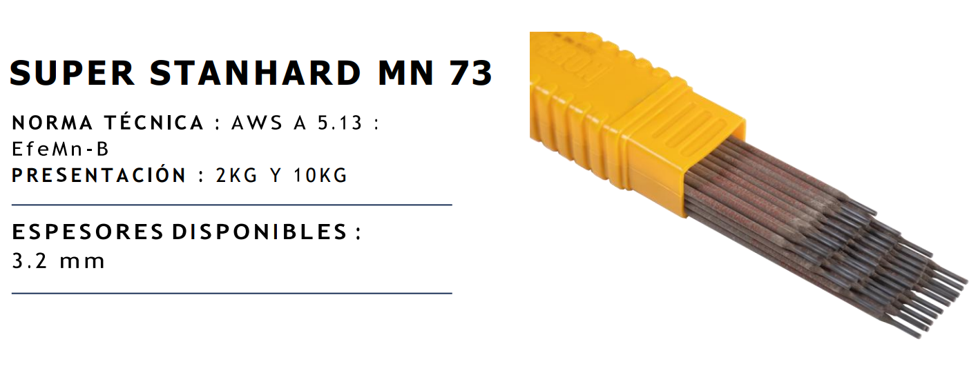El Electrodo SUPER STANHARD MN 73 está diseñado para aplicaciones de revestimiento y recuperación de piezas de acero al manganeso, ofreciendo alta resistencia al impacto y excelente tenacidad. Cumple con la norma técnica AWS A5.13 EFeMn-B, garantizando un rendimiento confiable en trabajos industriales exigentes.