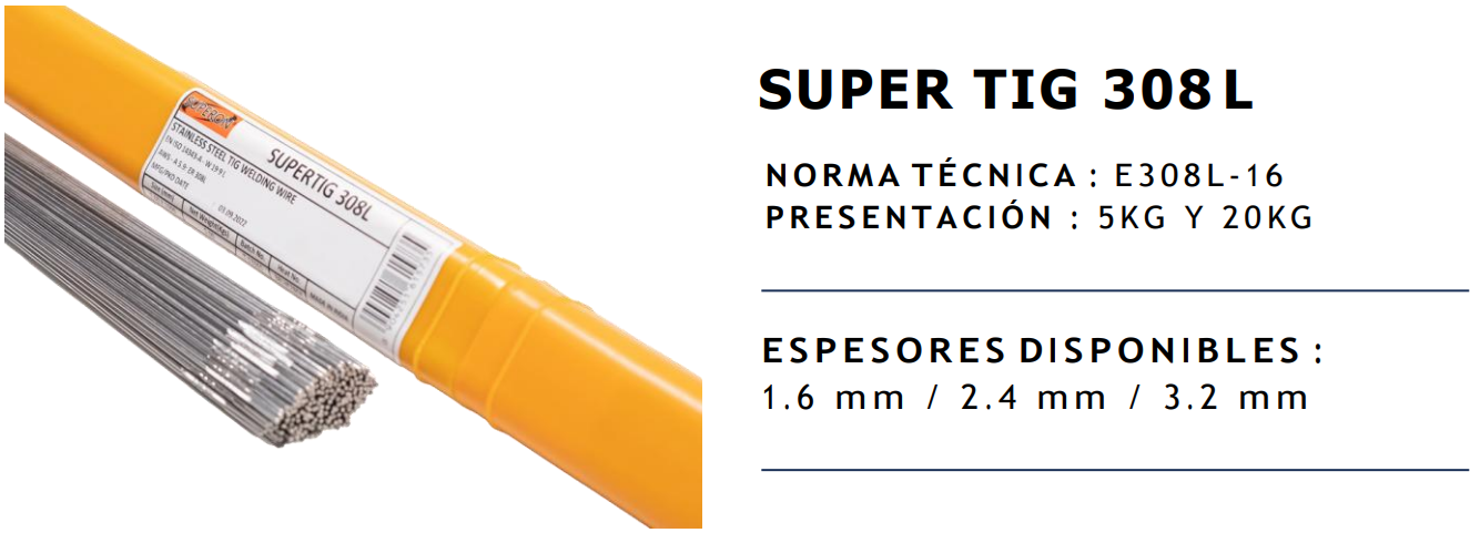 La Varilla SUPER TIG 308L está diseñada para la soldadura TIG de acero inoxidable, ofreciendo excelente resistencia a la corrosión, alta calidad en el cordón de soldadura y acabado limpio. Cumple con la norma técnica AWS A5.9 ER308L, garantizando un rendimiento confiable en aplicaciones industriales, alimentarias y estructuras en acero inoxidable.