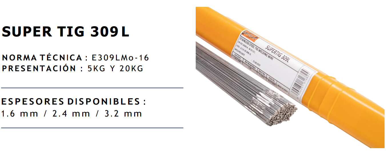 La Varilla SUPER TIG 309L está diseñada para la soldadura TIG de acero inoxidable, especialmente en uniones disímiles entre acero inoxidable y acero al carbono. Ofrece excelente resistencia a la corrosión, arco estable y cordones de alta calidad. Cumple con la norma técnica AWS A5.9 ER309LMo, garantizando un desempeño confiable en aplicaciones industriales exigentes.