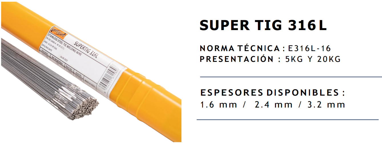 La Varilla SUPER TIG 316L está diseñada para la soldadura TIG de acero inoxidable, ofreciendo excelente resistencia a la corrosión, alta calidad en el cordón de soldadura y acabado limpio. Cumple con la norma técnica AWS A5.9 ER316L, garantizando un rendimiento confiable en aplicaciones industriales exigentes.